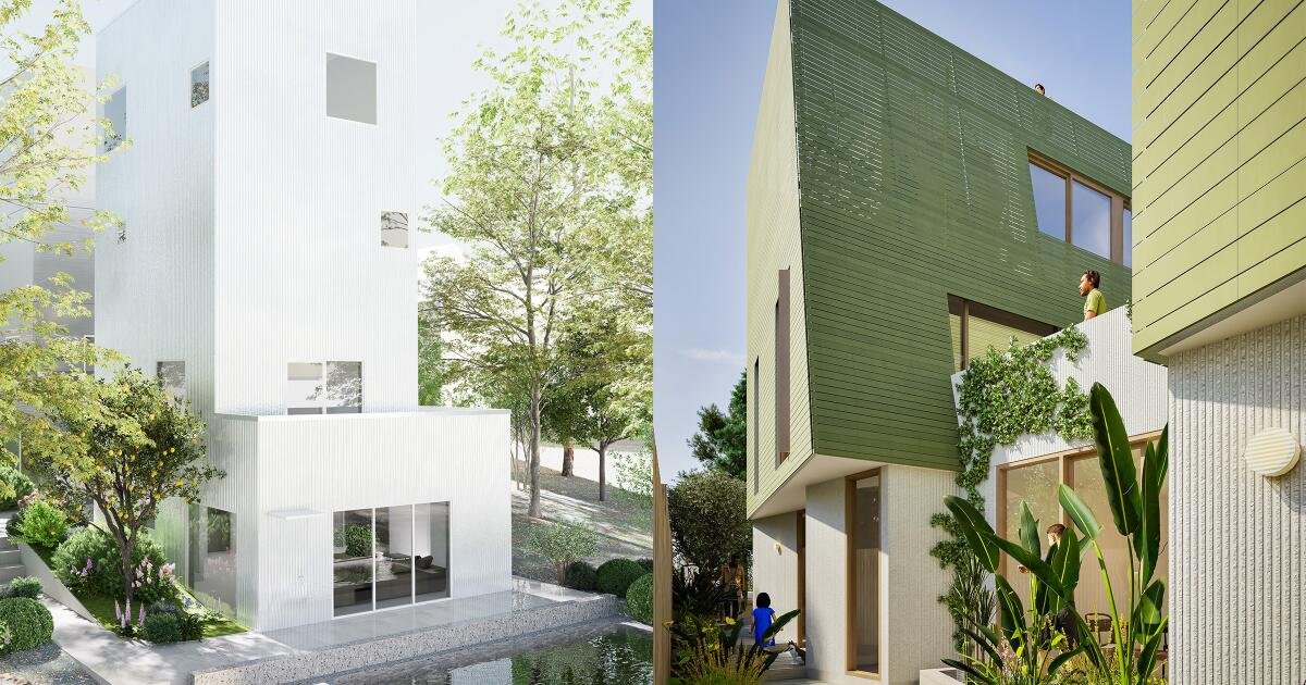 Winners of this design competition, announced at the end of May, placed six or more housing units on a single site, sometimes dividing it into separate lots. One proposal created rowhouses, slightly cracked apart to identify individual homes and entrances as they cascade along an irregular site. A communal yard opens to the street in another project, with roof gardens between separated, two-story homes atop ADUs that can be rented or joined back to each of several main houses on the site. Other designs show that vertical architecture, in the form of handsome new residential towers from three to seven stories, can comfortably coexist with L.A.’s low-rise housing stock when the design is thoughtful enough.