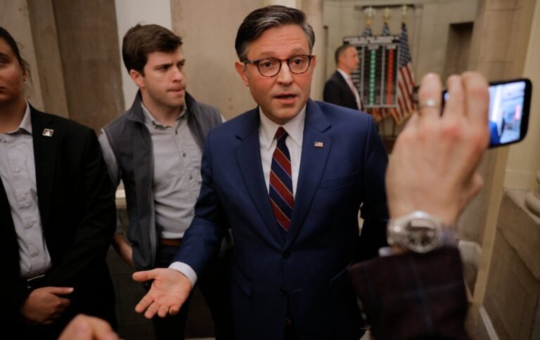 Speaker of the House Mike Johnson talks on the 28th day of the federal government shutdown at the Capitol.