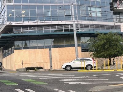 Plywood at 1001 Broadway after the sudden closure of Whole Foods earlier this year (Image: CHS)
