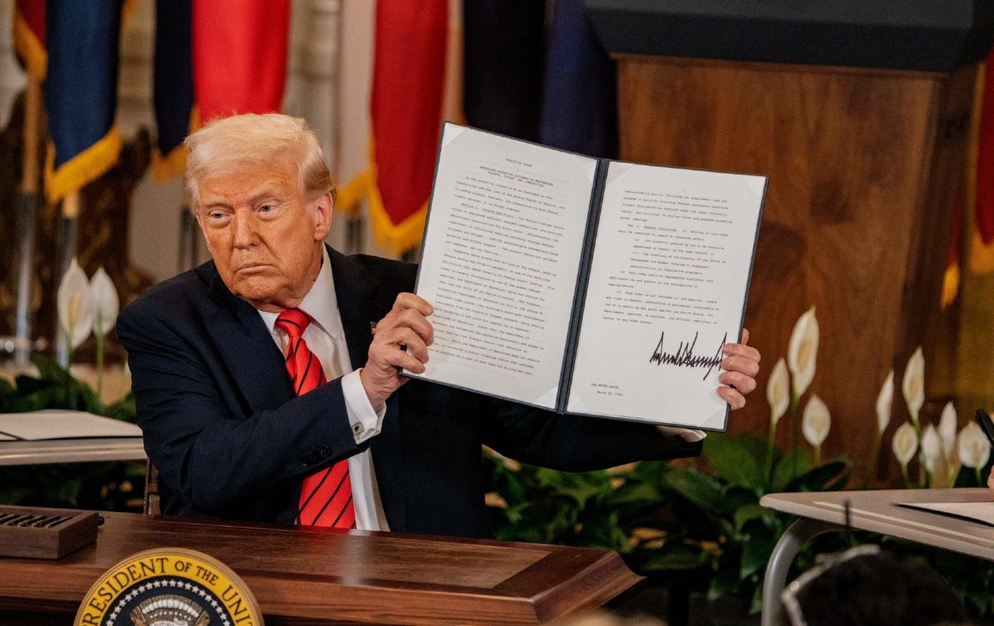 Donald Trump signs an executive order to eliminate the Department of Education in Washington, D.C. on March 20, 2025.