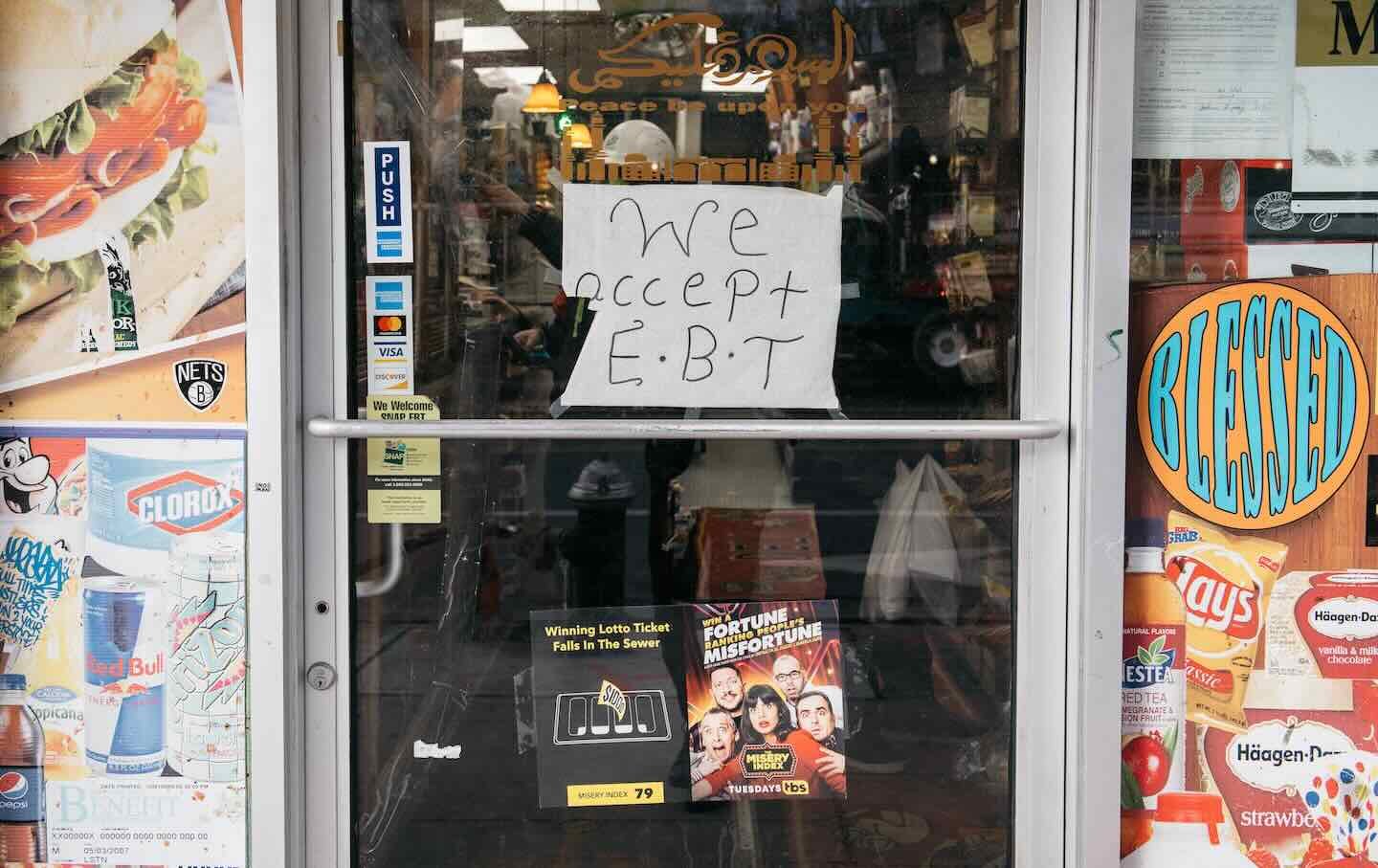 A sign alerting customers about SNAP benefits is displayed at a Brooklyn grocery store on December 5, 2019, in New York City. Earlier in the week the Trump administration announced stricter requirements for food stamp benefits that would cut support for nearly 700,000 poor Americans.